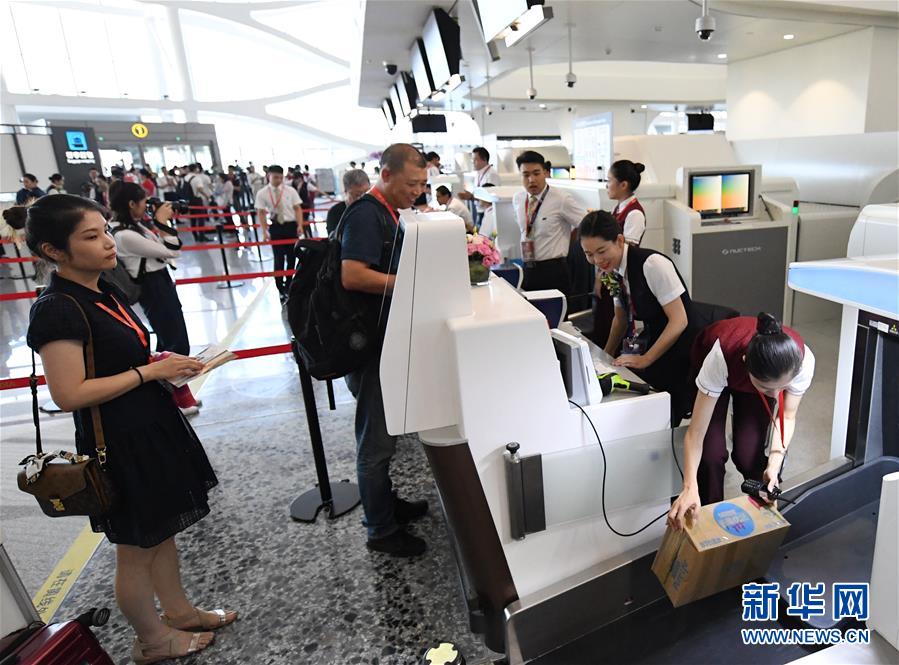 9月25日,工作人員在北京大興國際機場為乘客辦理行李托運。新華社記者張晨霖攝