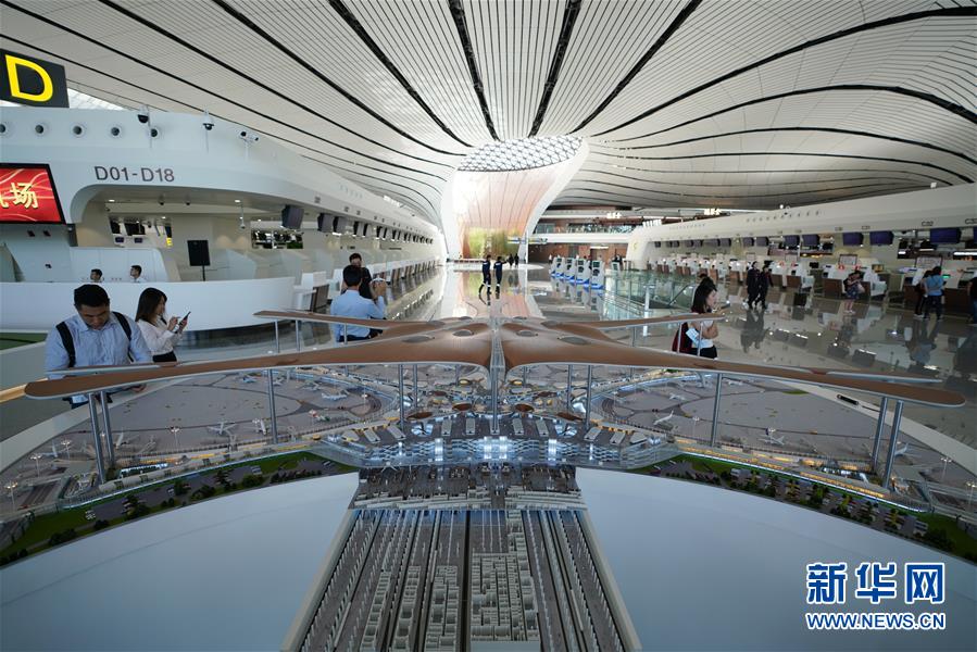 9月25日拍攝的在北京大興國際機場航站樓內擺放的機場航站樓模型。新華社記者鞠煥宗攝