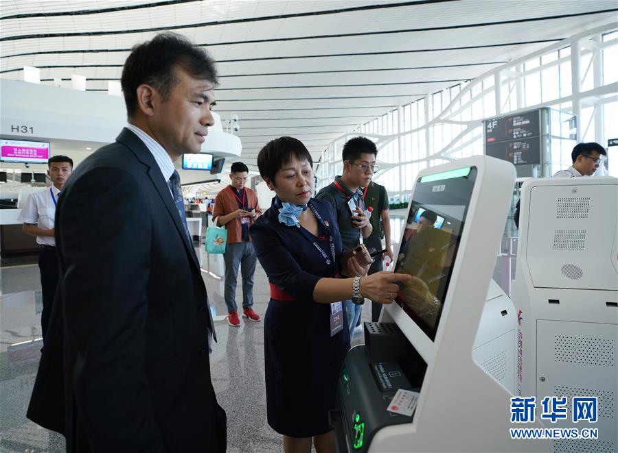 9月25日,中國南方航空公司工作人員(左)在北京大興國際機場介紹自助行李托運設備。新華社記者鞠煥宗攝