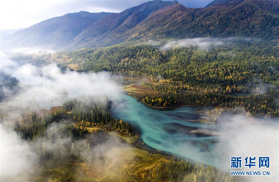 9月24日無人機拍攝的喀納斯景區(qū)風(fēng)光。 新華社記者 王菲 攝