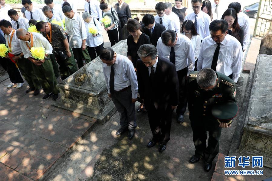 9月30日,在越南北部河南省,人們在中國烈士紀(jì)念碑前默哀。 中國駐越南大使館館員、中國援越老戰(zhàn)士及其親屬、在越中資機構(gòu)和留學(xué)生代表等30日前往位于越南河南省的金榜烈士陵園,祭奠長眠于此的14名中國援越烈士。越中友協(xié)副主席阮榮光等越方代表也參加了祭掃活動。 新華社記者 王迪 攝