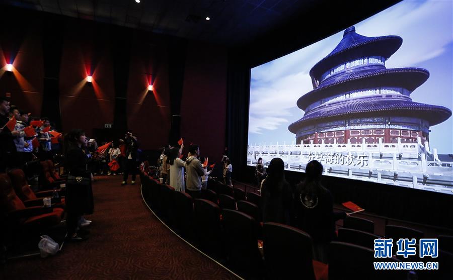 9月30日,在美國洛杉磯,觀眾在電影《我和我的祖國》當(dāng)?shù)厥子扯Y上合唱同名主題歌。新華社記者李穎攝