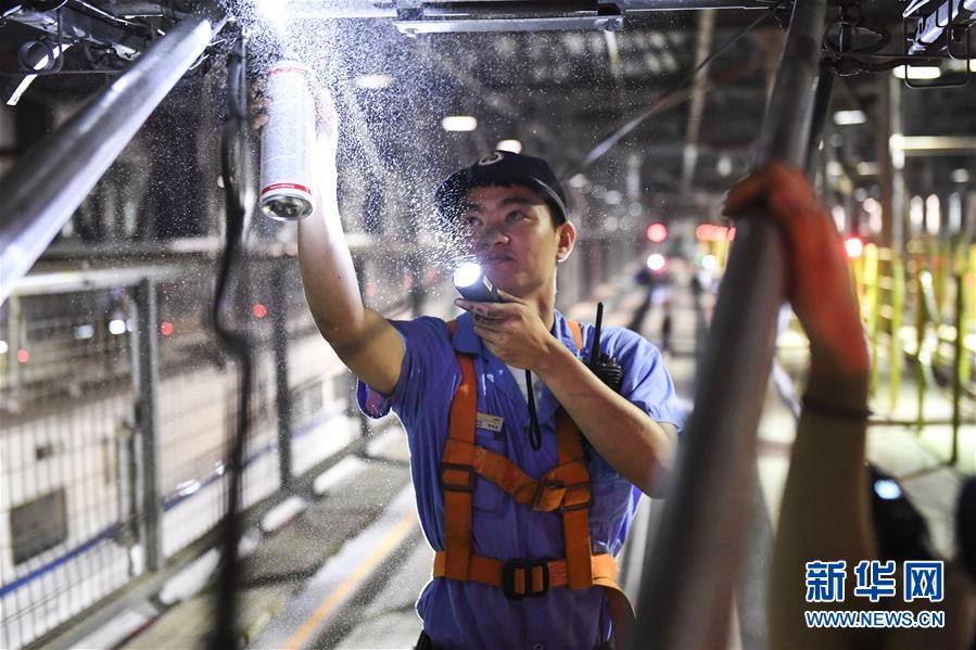 “動(dòng)車醫(yī)生”用檢漏劑對受電弓升弓氣囊進(jìn)行檢查(10月2日攝)。 新華社記者 曹祎銘 攝