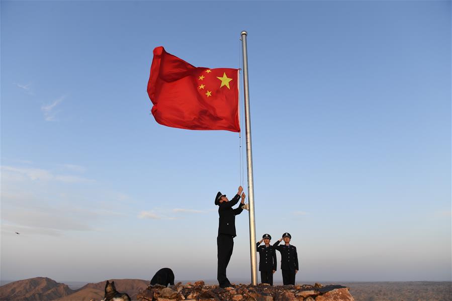 9月27日,內(nèi)蒙古自治區(qū)額濟(jì)納旗算井子邊境派出所民警在大紅山上舉行升國(guó)旗儀式。新華社記者劉磊攝