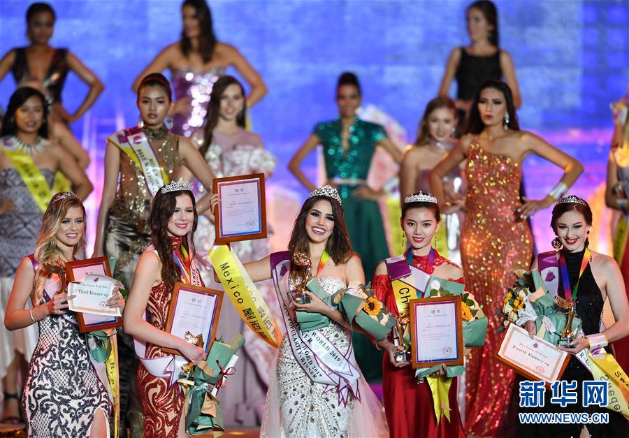10月6日,選手在頒獎儀式上。 10月6日晚,2019世界旅游小姐全球總決賽頒獎盛典在山東青島舉行。來自67個國家和地區(qū)的佳麗在民族服裝、泳裝、晚裝以及才藝展示環(huán)節(jié)各展風(fēng)采,最終來自墨西哥和加拿大的兩名選手分獲冠亞軍,中國選手譚若依獲得季軍。 新華社記者 李紫恒 攝
