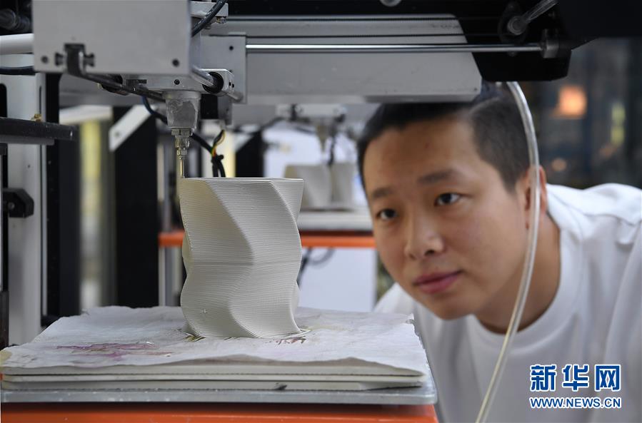 在江西景德鎮(zhèn)陶溪川文創(chuàng)街區(qū)的陶瓷3D打印體驗中心,一位工作人員在用3D打印技術(shù)制作陶瓷花瓶(7月26日攝)。新華社記者 萬象 攝