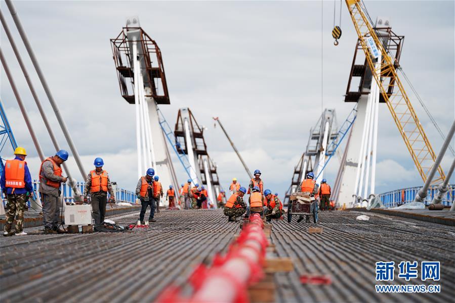 工人在大橋上進行橋面鋪裝施工作業(yè)(8月19日攝)。新華社記者王建威攝