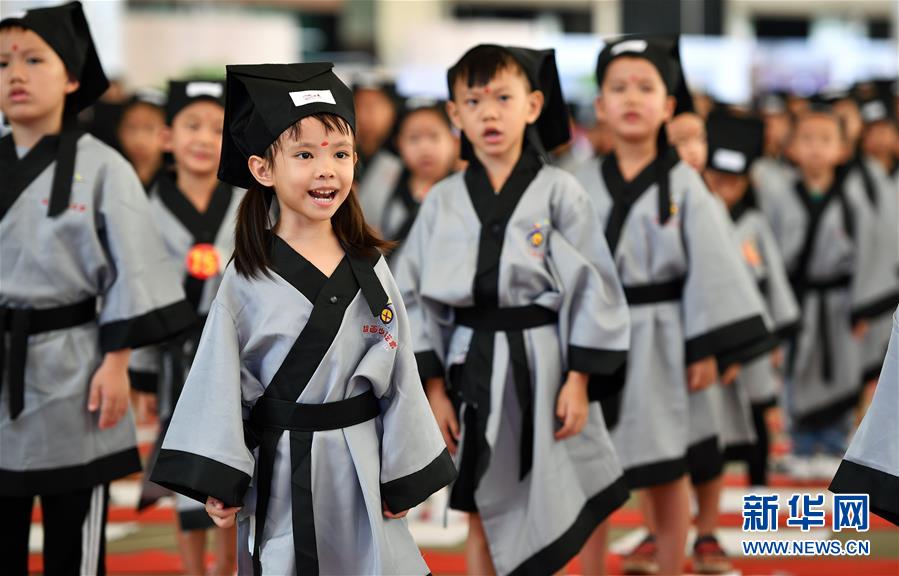 10月13日,參加儀式的小朋友在誦讀《三字經(jīng)》。當(dāng)日,??诤嬌賰核囆g(shù)中心為500名小朋友舉行“開(kāi)筆禮”,通過(guò)“點(diǎn)朱砂,啟智慧”“習(xí)書法,描人字”等儀式讓孩子們體驗(yàn)中國(guó)傳統(tǒng)文化。新華社記者郭程攝
