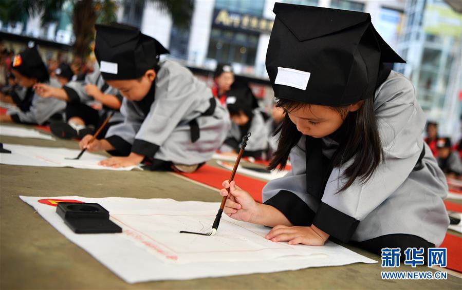 10月13日,參加儀式的小朋友在書寫“人”字。當(dāng)日,海口胡畫少兒藝術(shù)中心為500名小朋友舉行“開筆禮”,通過“點(diǎn)朱砂,啟智慧”“習(xí)書法,描人字”等儀式讓孩子們體驗(yàn)中國傳統(tǒng)文化。新華社記者郭程攝