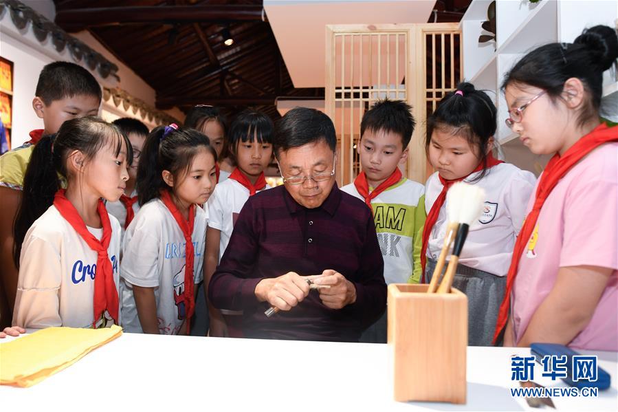 10月14日,湖筆制作技藝國(guó)家級(jí)代表性傳承人邱昌明(右四)在非遺活態(tài)傳承館展示湖筆制作的擇筆技能。 新華社記者 黃宗治 攝