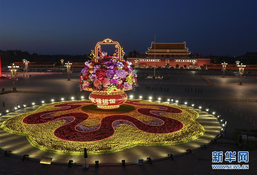這是10月14日拍攝的天安門(mén)廣場(chǎng)中心花壇。 10月14日,以“花果籃”為主造型的天安門(mén)廣場(chǎng)中心花壇吸引了眾多游客參觀拍照?!盎ü@”的夜景更是流光溢彩,絢爛迷人。 新華社記者 殷剛 攝
