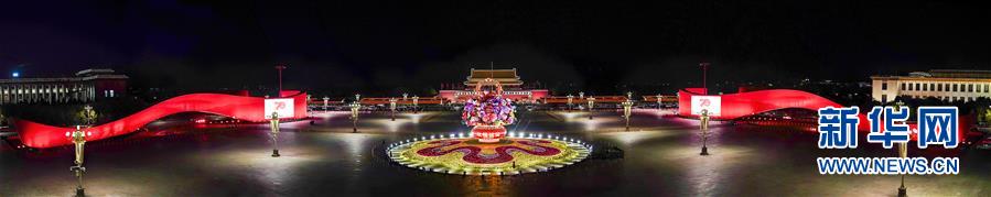 這是10月14日拍攝的天安門(mén)廣場(chǎng)中心花壇(全景拼接圖片)。 10月14日,以“花果籃”為主造型的天安門(mén)廣場(chǎng)中心花壇吸引了眾多游客參觀拍照?!盎ü@”的夜景更是流光溢彩,絢爛迷人。 新華社記者 殷剛 攝