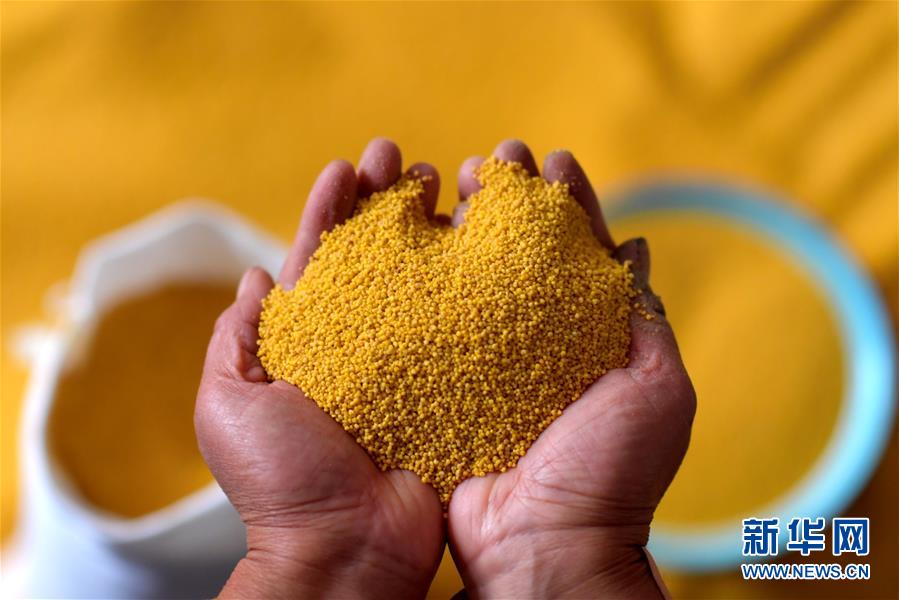 在奪火鄉(xiāng)高谷堆村,村民展示收獲的小米(10月14日攝)。 新華社記者 曹陽(yáng) 攝