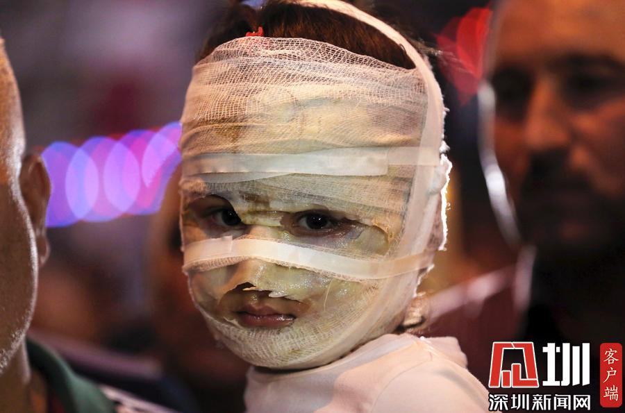 當(dāng)?shù)貢r(shí)間2016年7月9日,伊拉克卡拉達(dá),4歲的Asal Ahmed在爆炸現(xiàn)場(chǎng)被爸爸抱著。開齋節(jié)期間,Asal和媽媽一起逛街,結(jié)果碰上一起自殺性炸彈襲擊,兩人都嚴(yán)重?zé)齻?/p>