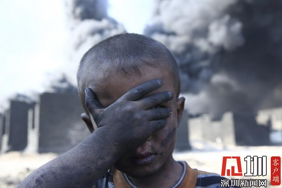 當(dāng)?shù)貢r(shí)間2016年10月25日,伊拉克摩蘇爾,遭伊斯蘭國(guó)縱火的油井冒出濃濃黑煙,嚴(yán)重影響了鎮(zhèn)子里的生活,孩子們的手和臉都被熏黑了。伊拉克政府軍于10月16日正式展開收復(fù)摩蘇爾的戰(zhàn)役。