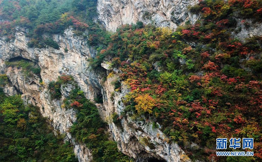 這是10月19日無(wú)人機(jī)拍攝的河北省涉縣太行紅葉大峽谷景色。新華社記者王曉攝
