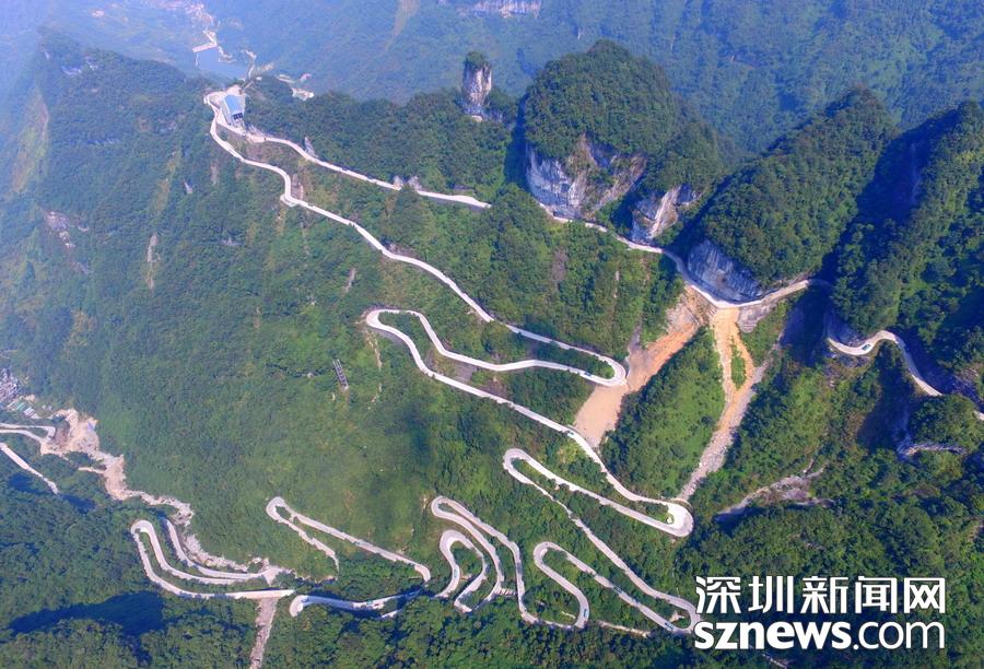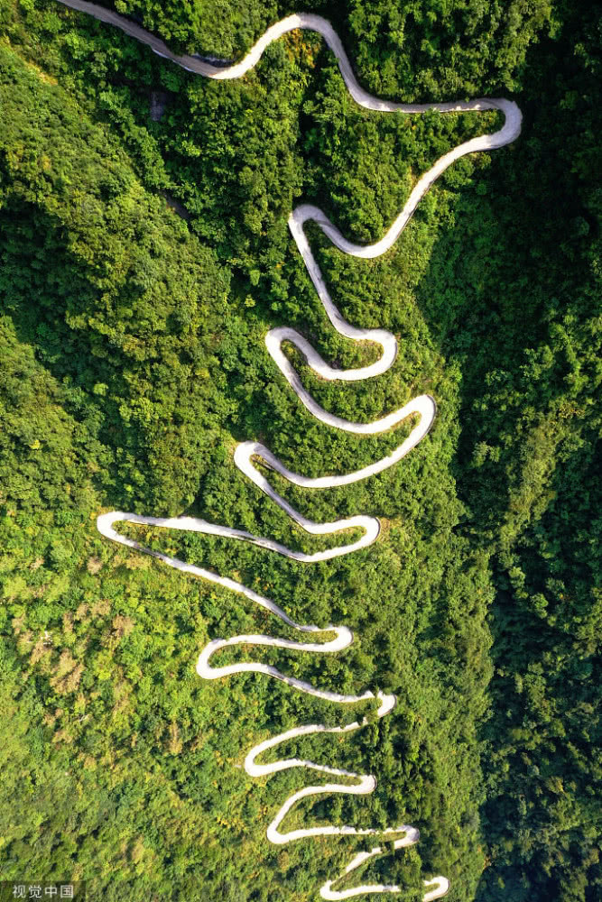 天門山盤山公路位于湖南省張家界市境內(nèi)的國家森林公園天門山上,盤山公路全長10.77公里,海拔從200米急劇提升到1300米,大道兩側(cè)絕壁千仞,空谷幽深,共計99個彎,180度急彎此消彼長,似玉帶環(huán)繞,航拍鏡頭下蜿蜒曲折的道路彎彎緊連,層層迭起,宛如迷宮般的“納斯卡線條”,被譽為“天下第一公路奇觀”,同時它也是世界上最危險的十大公路之一。