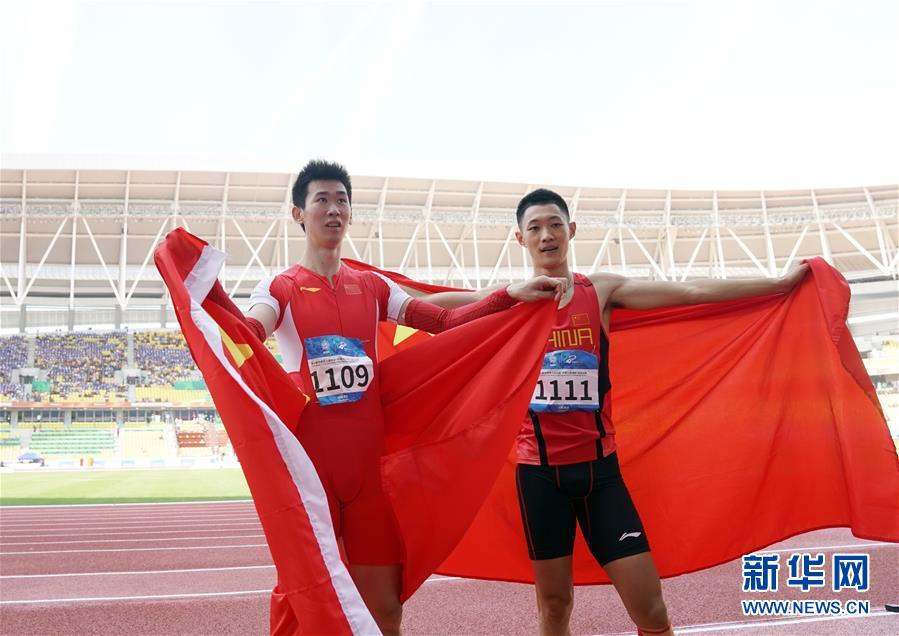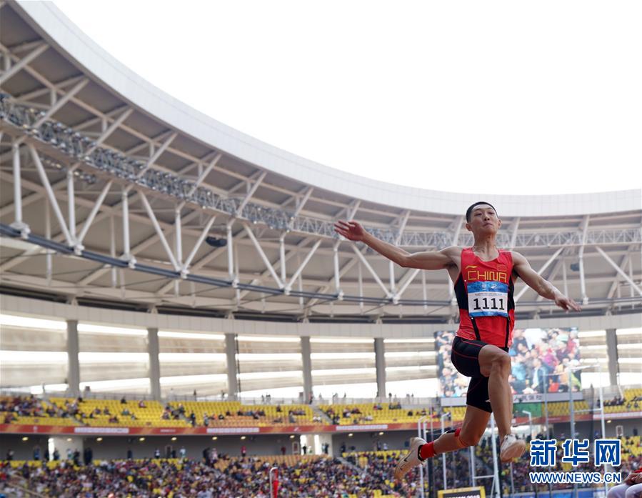 10月24日,中國選手王嘉男在比賽后慶祝。 當(dāng)日,在武漢舉行的第七屆世界軍人運(yùn)動會田徑項(xiàng)目男子跳遠(yuǎn)決賽中,中國選手王嘉男、黃常洲分別以8米15和8米12的成績獲得冠亞軍。 新華社記者金良快攝