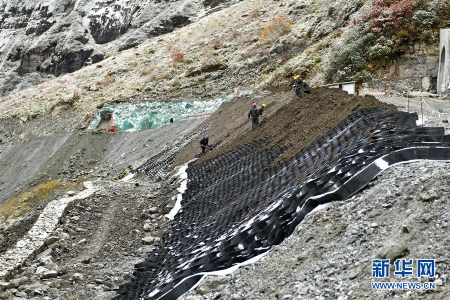 施工人員在鋪設(shè)邊坡綠化土工格室(10月24日攝)。新華社記者李鑫攝