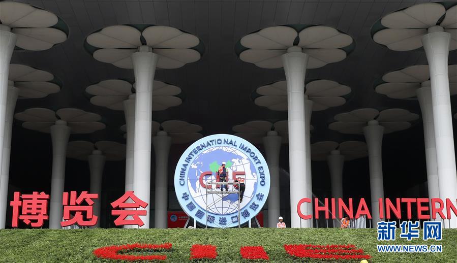 10月25日,施工人員在國展中心(上海)南廣場安裝進(jìn)博會標(biāo)志。 新華社記者 方喆攝