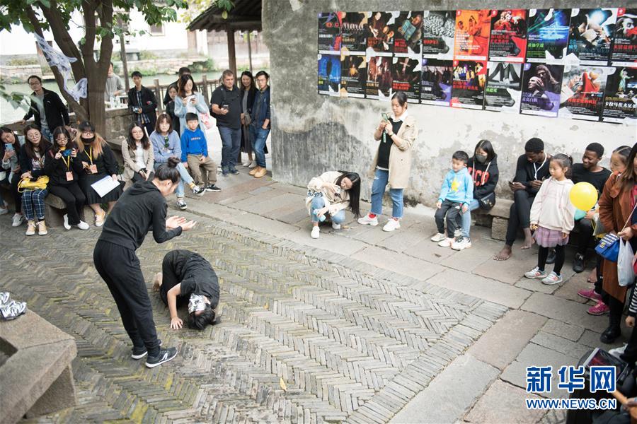10月26日,一個劇團在烏鎮(zhèn)街頭表演戲劇。 新華社記者翁忻旸攝