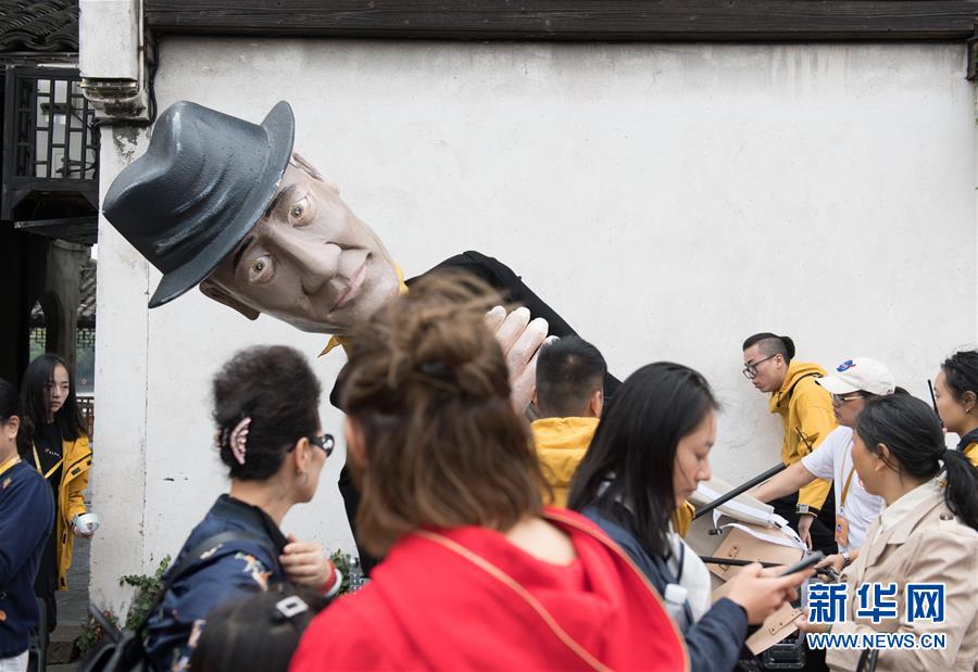 10月26日,游客經過一個正在豎起的戲劇人偶。 新華社記者翁忻旸攝