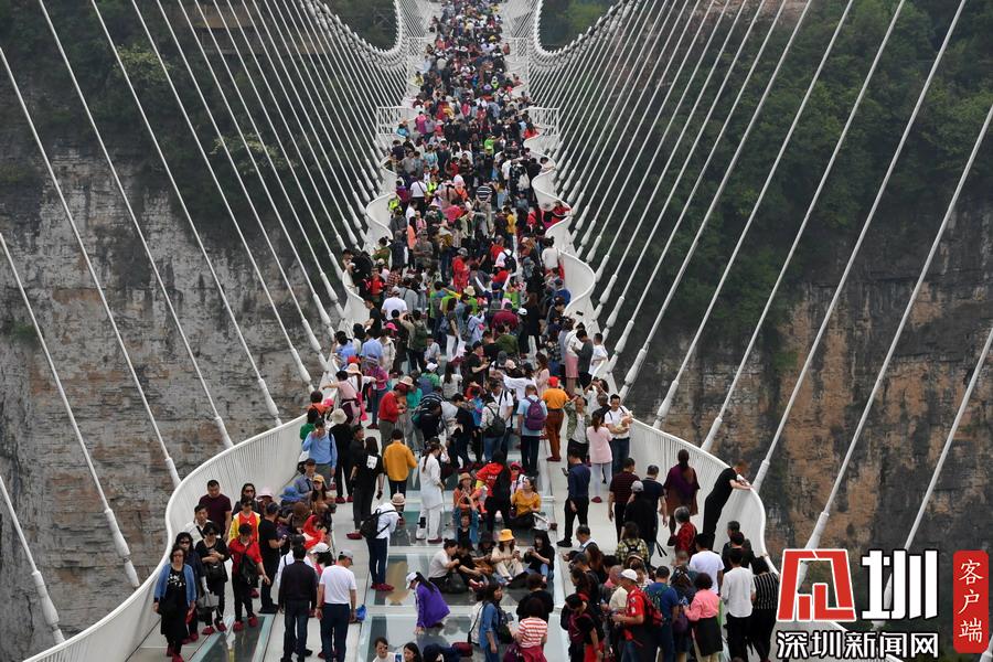 2019年4月24日,湖南張家界大峽谷玻璃橋上,游客們擺出各種姿勢(shì)拍照。剛開始,游客們?cè)诙虝旱目謶种螅S之而來的是滿滿的興奮,男女老少紛紛在這座懸在300多米高空中的全透明玻璃橋上不停拍照,從一開始走上橋緊張的不敢踩在玻璃上,到最后在玻璃橋上的各種躺和趴,各種姿勢(shì)各種創(chuàng)意各種拍攝,游客們完全忘我地開心游玩。張家界大峽谷玻璃橋,是世界首座斜拉式高山峽谷玻璃橋,玻璃橋全長(zhǎng)430米,寬6米,橋身距離谷底垂直落差300米,大橋表面由99塊透明玻璃鋪設(shè)而成,整個(gè)工程無鋼筋混凝土橋墩。