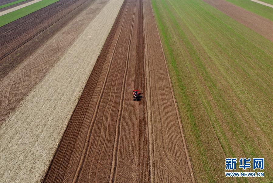 河南省寶豐縣肖旗鄉(xiāng)解莊村農(nóng)民駕駛機(jī)械在農(nóng)田里搶種冬小麥(10月17日無人機(jī)拍攝)。新華社記者李嘉南攝