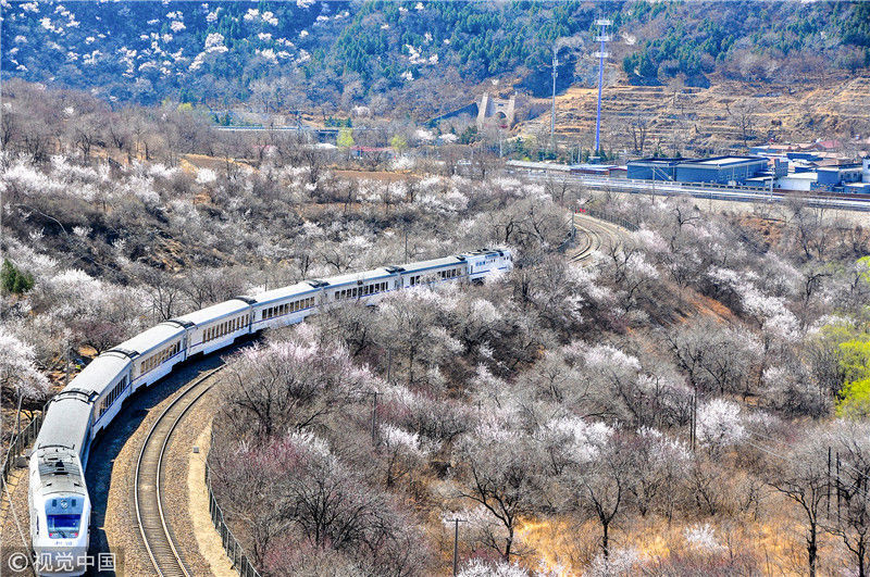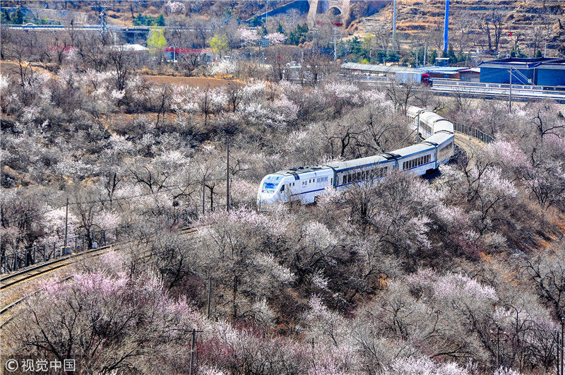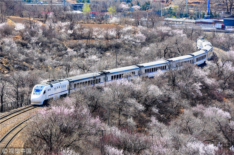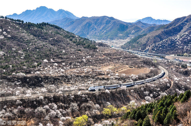 2019年3月22日,北京居庸關(guān)附近的山花盛開,S2線列車穿行在花海之中,構(gòu)成一幅美麗的畫面。時(shí)永平/千龍圖像/視覺中國編輯/陳進(jìn)