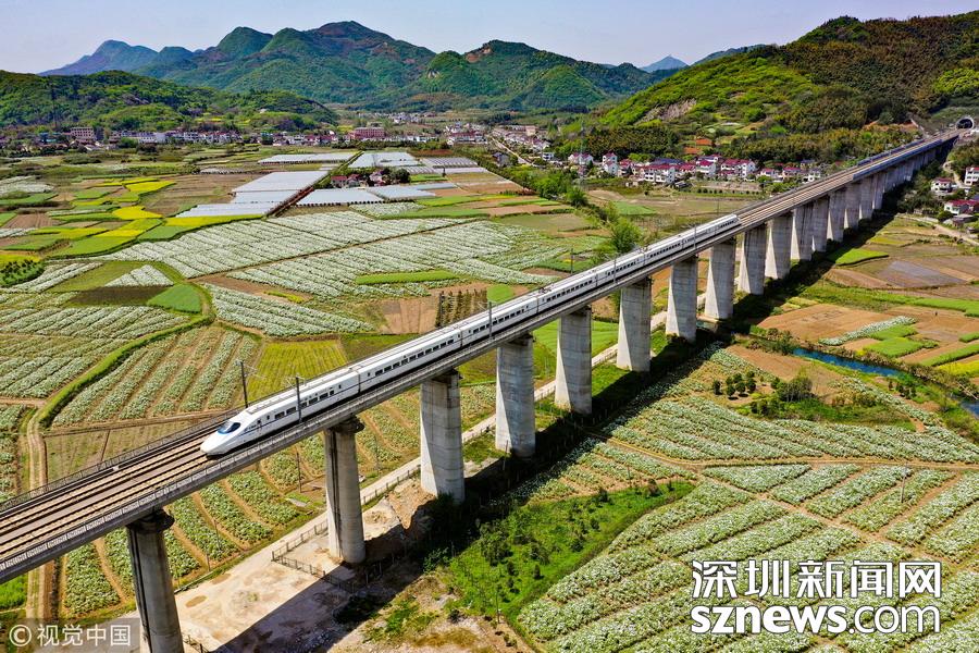 2019年4月8日,一列高鐵列車從京福高鐵安徽銅陵段一片盛開的鳳丹花海中駛過。