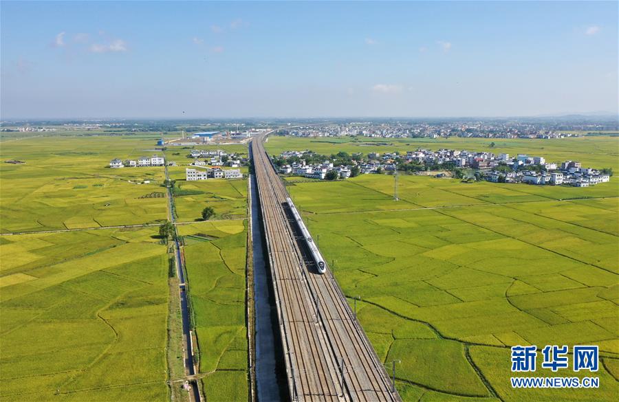 10月29日,列車從廣西賓陽縣古辣鎮(zhèn)豐收的稻田間駛過(無人機(jī)拍攝)。新華社記者陸波岸攝