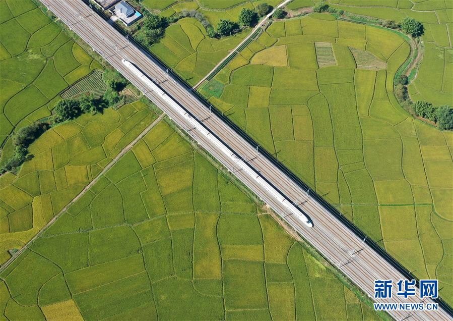 10月29日,列車(chē)從廣西賓陽(yáng)縣古辣鎮(zhèn)豐收的稻田間駛過(guò)(無(wú)人機(jī)拍攝)。新華社記者陸波岸攝