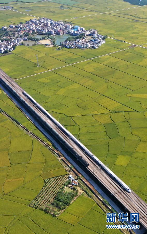 10月29日,列車從廣西賓陽縣古辣鎮(zhèn)豐收的稻田間駛過(無人機(jī)拍攝)。新華社記者陸波岸攝