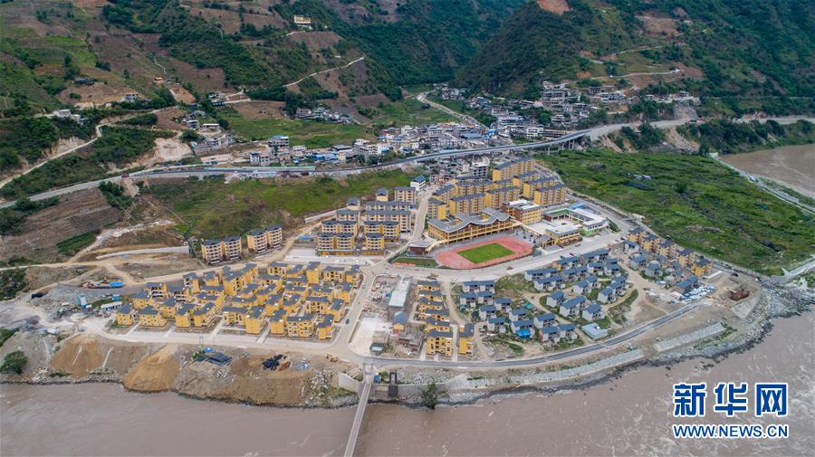 建于怒江邊的大興地鎮(zhèn)維拉壩“珠海小區(qū)”內(nèi)的學(xué)校和住房已初現(xiàn)規(guī)模(6月24日無(wú)人機(jī)拍攝)。新華社記者胡超攝