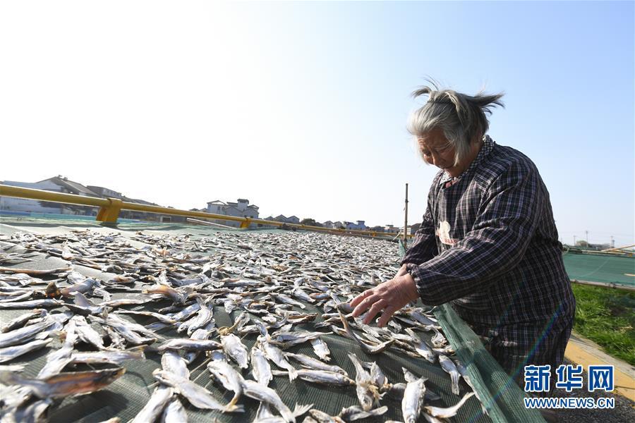 3月12日,浙江省湖州市吳興高新區(qū)幻溇村村民在翻動(dòng)晾曬的魚(yú)干。近日,太湖南岸湖州地區(qū)久雨初晴,漁民忙著制作、晾曬魚(yú)干。新華社記者翁忻旸攝