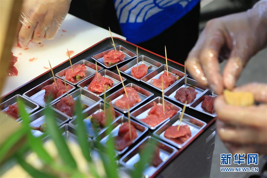 11月7日,切魚師傅為參觀者準(zhǔn)備用于品嘗的藍(lán)鰭金槍魚魚肉。第二屆中國國際進(jìn)口博覽會正在上海國家會展中心舉行。博覽會的食品及農(nóng)產(chǎn)品展區(qū)里匯集了來自世界各地的美食,同時(shí)也上演各種精彩美食秀。11月7日,來自日本長崎魚市株式會社的專業(yè)切魚師傅現(xiàn)場解體一條70公斤的藍(lán)鰭金槍魚,吸引大量參觀者觀看、品嘗。新華社記者隋先凱攝