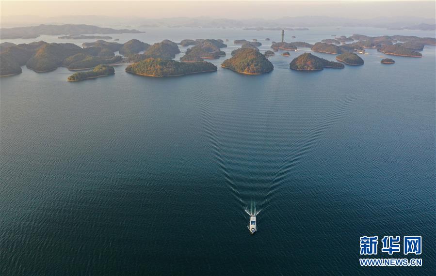 11月9日無人機拍攝的廬山西海。 當日,落日余暉下的江西廬山西海山青水藍,美不勝收。 新華社記者 周密 攝