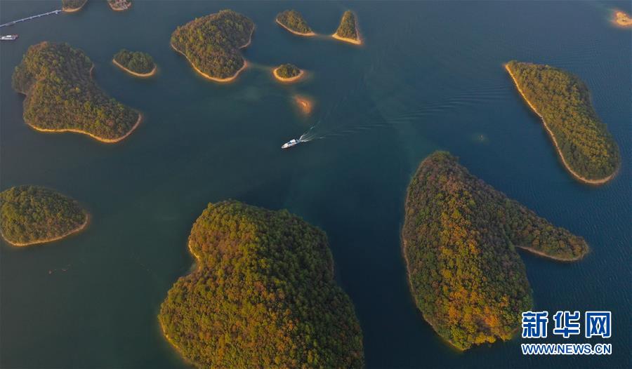 11月9日無人機(jī)拍攝的廬山西海。 當(dāng)日,落日余暉下的江西廬山西海山青水藍(lán),美不勝收。 新華社記者 周密 攝
