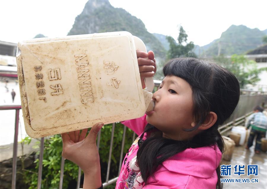 在廣西大化瑤族自治縣板升鄉(xiāng)八好小學(xué),一名學(xué)生喝水桶里的雨水(2014年11月24日攝)。八好小學(xué)有400多名學(xué)生,曾僅有一個(gè)不足100立方米的水柜,用于收集儲(chǔ)存樓頂?shù)挠晁瑢W(xué)生需定期定量用水。遇到長(zhǎng)時(shí)間不下雨,學(xué)校需要到鄉(xiāng)政府所在地運(yùn)水。如今,學(xué)校修建了5個(gè)大水柜,并從兩公里外引泉水到校園,飲水難問(wèn)題得到解決。新華社記者黃孝邦攝
