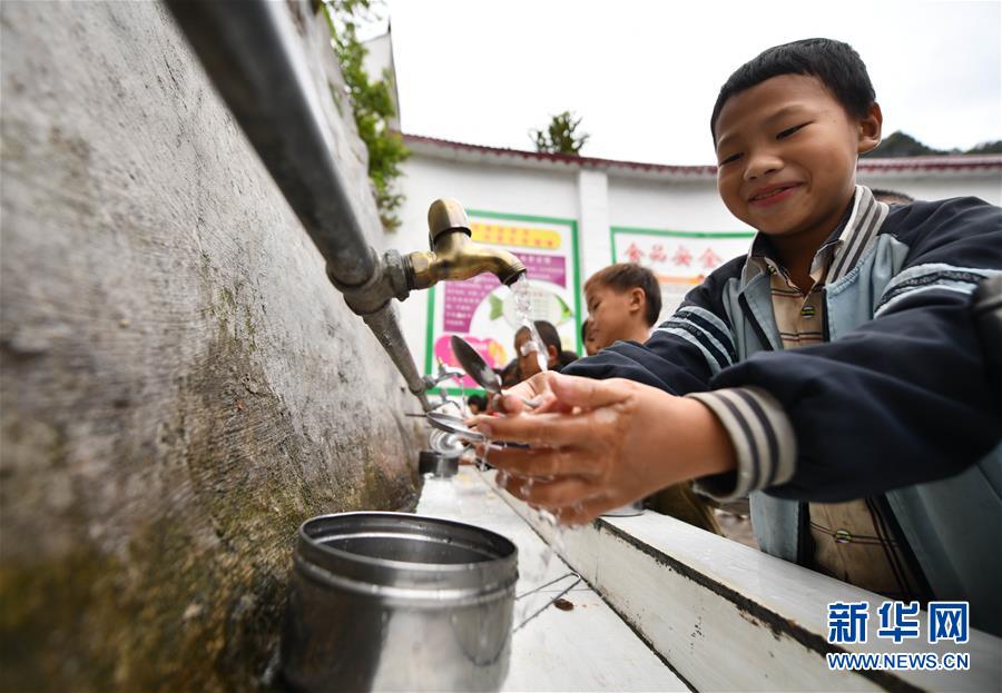 在廣西大化瑤族自治縣板升鄉(xiāng)八好小學,同學們在用自來水洗餐具(11月13日攝)。新華社記者黃孝邦攝