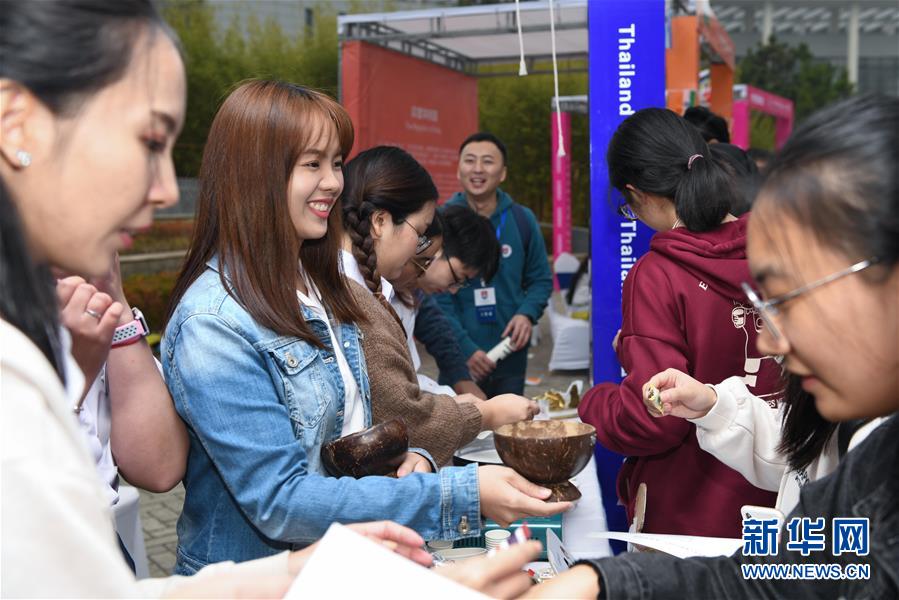 11月17日,來自泰國的留學(xué)生(左二)在國際文化節(jié)上將美食給觀眾品嘗。新華社記者 張端 攝