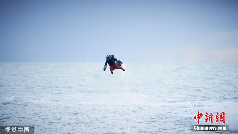 11月18日訊,英國布萊頓,英國發(fā)明家理查德·布朗寧穿著一套由身體控制、噴氣發(fā)動機驅動、風力導向的飛行服,以高達每小時85.06英里(約137公里)的飛行速度,打破了自己創(chuàng)下的噴氣式飛行服速度的吉尼斯世界紀錄。圖片來源:視覺中國