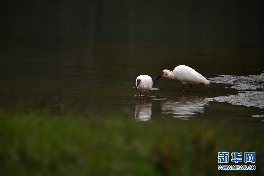 11月19日,朱鹮在陜西省漢中市西鄉(xiāng)縣峽口鎮(zhèn)井壩村牧馬河里覓食。 新華社記者陶明攝