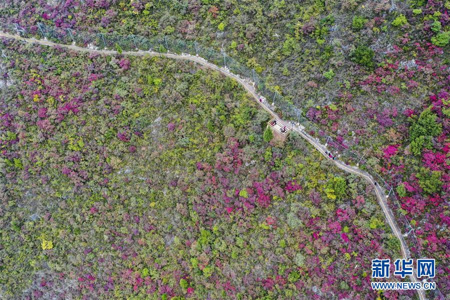 11月23日,游客在位于長江巫峽段的巫山文峰景區(qū)游覽(無人機拍攝)。初冬時節(jié),位于重慶巫山縣境內的長江巫峽段呈現(xiàn)出一江碧水東流、兩岸層林盡染的秀美景象。新華社記者王全超攝