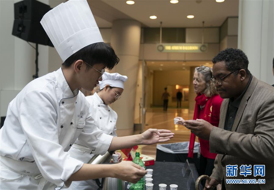 11月22日,在美國華盛頓,人們?cè)凇氨本┤铡蔽幕瘡R會(huì)活動(dòng)上品嘗中國小吃。作為中國北京和美國首都華盛頓締結(jié)友好城市35周年慶?;顒?dòng)的一部分,“北京日”文化廟會(huì)22日在華盛頓羅納德·里根大廈和國際貿(mào)易中心舉行。新華社記者劉杰攝