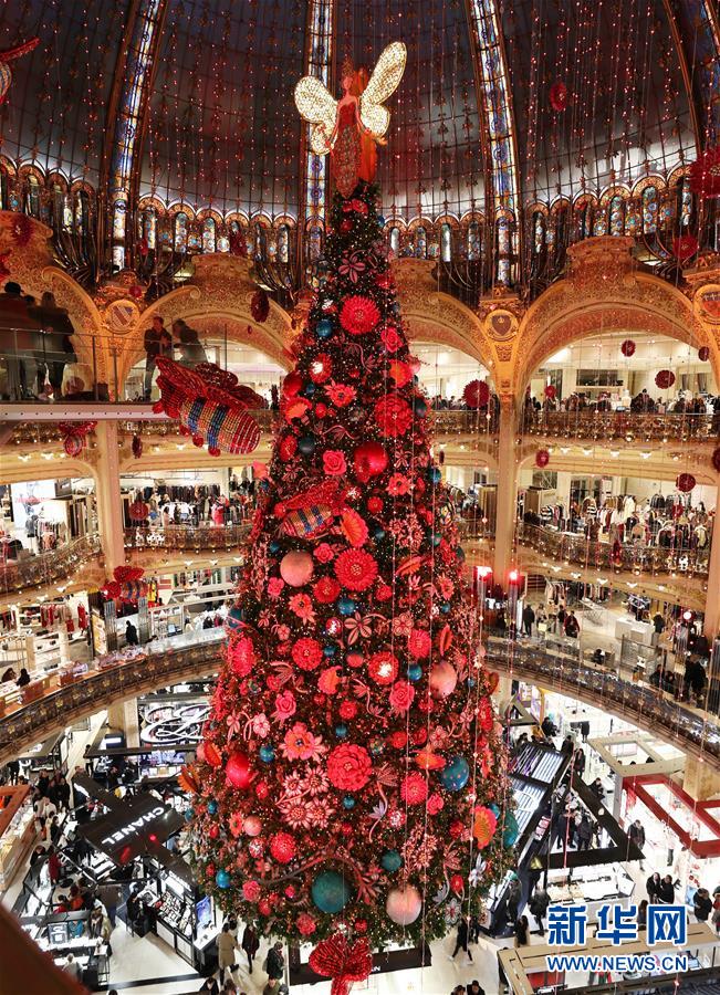這是11月24日在法國(guó)巴黎老佛爺百貨公司拍攝的點(diǎn)燈后的巨型圣誕樹(shù)。 新華社記者高靜攝