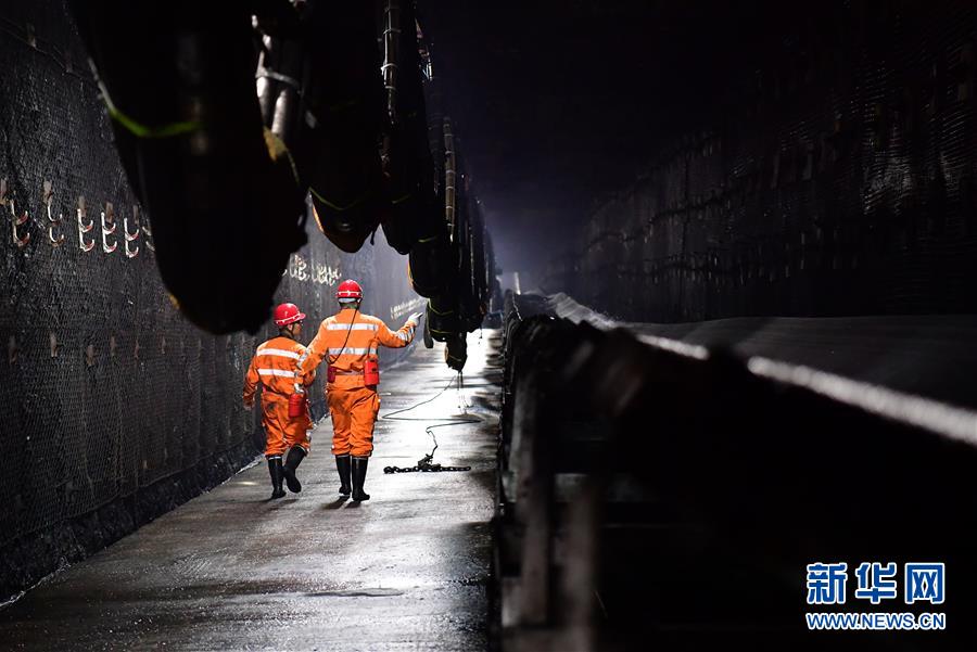 11月26日,在上灣煤礦12402綜采面內(nèi),工作人員沿著輸送帶進(jìn)行巡視。 新華社記者 邵瑞 攝