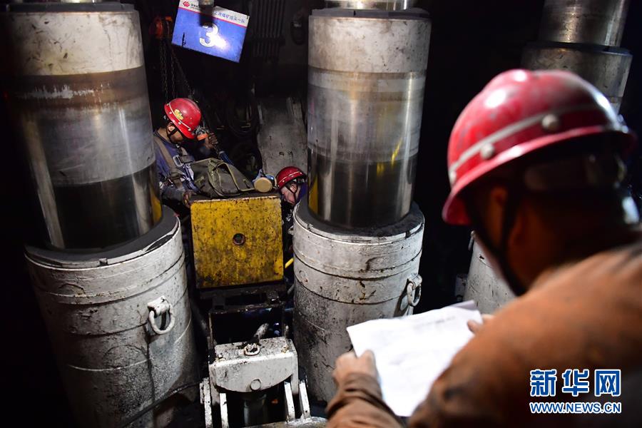 11月26日,在上灣煤礦12402綜采面內(nèi),工作人員對照清單檢修液壓支架。 新華社記者 邵瑞 攝