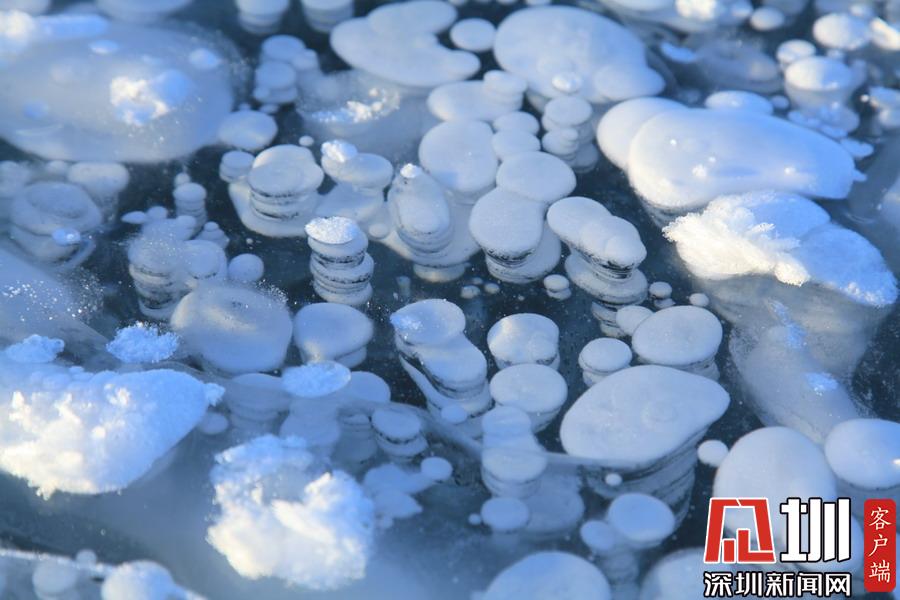 地處漠河市觀音山景區(qū)的蓮花湖湖面已經(jīng)完全封凍,冰層最厚的地方已經(jīng)超過60厘米,透過晶瑩剔透的冰面可以看到一串串潔白的氣泡分布在冰層之中,形成一組組惟妙惟肖的“冰泡”奇觀。