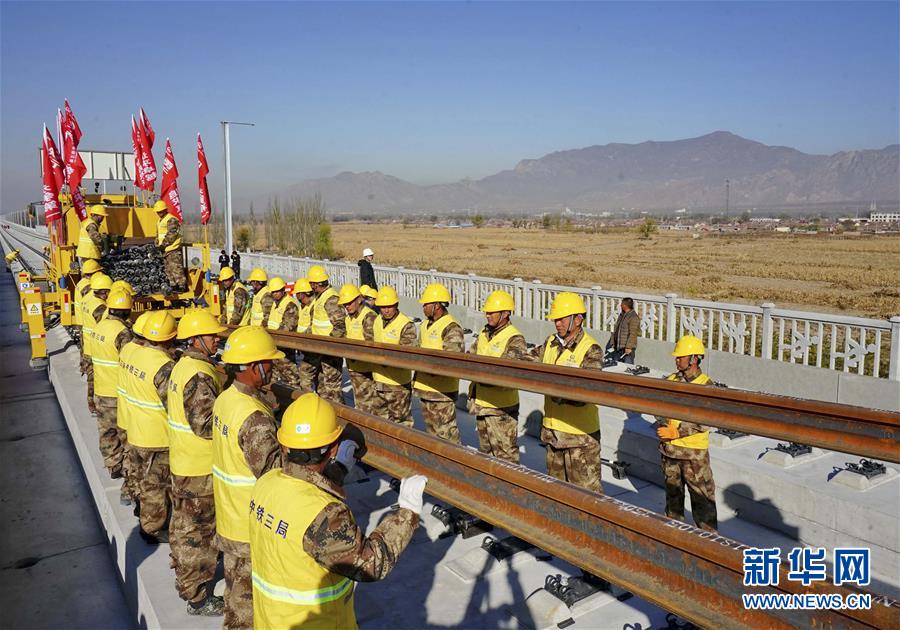 11月1日,在京張高鐵河北懷來段鋪軌現(xiàn)場,中鐵三局的工人正在鋪設京張高鐵全線第一節(jié)軌排。